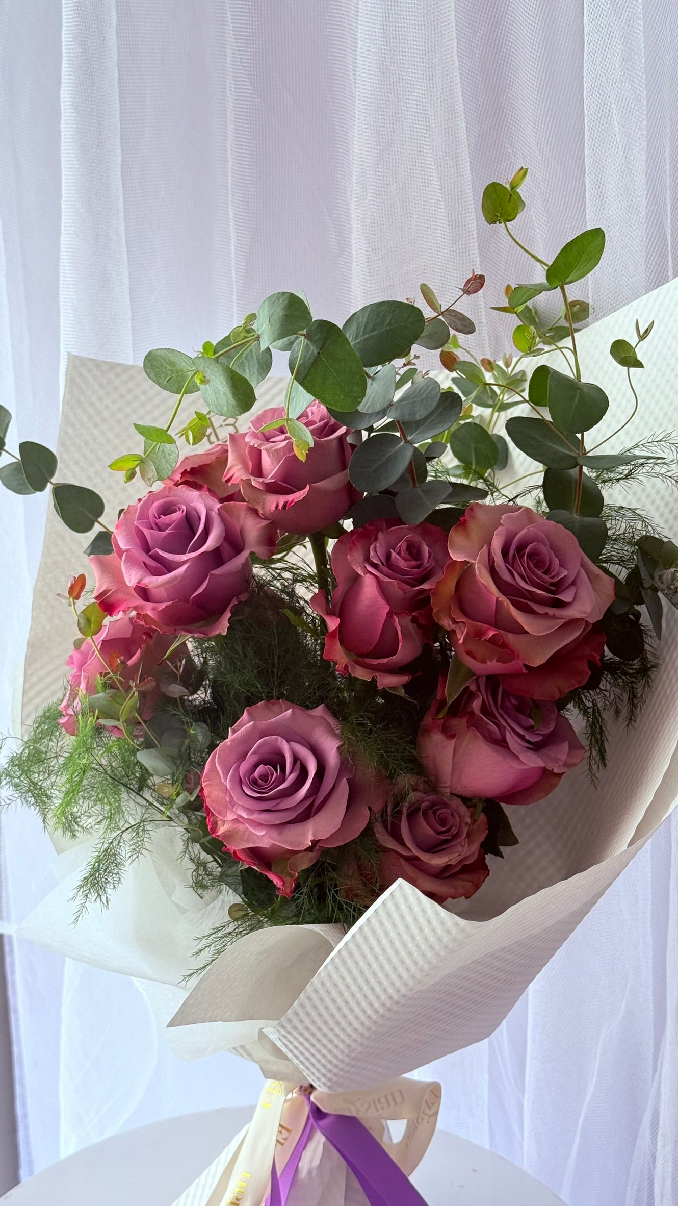 Soft, romantic, and effortlessly refined — this bouquet features premium roses in dreamy tones, artfully paired with airy greenery and delicate textures. Wrapped in elegant neutral paper and finished with a signature ribbon, it’s designed to feel modern, graceful, and deeply meaningful.