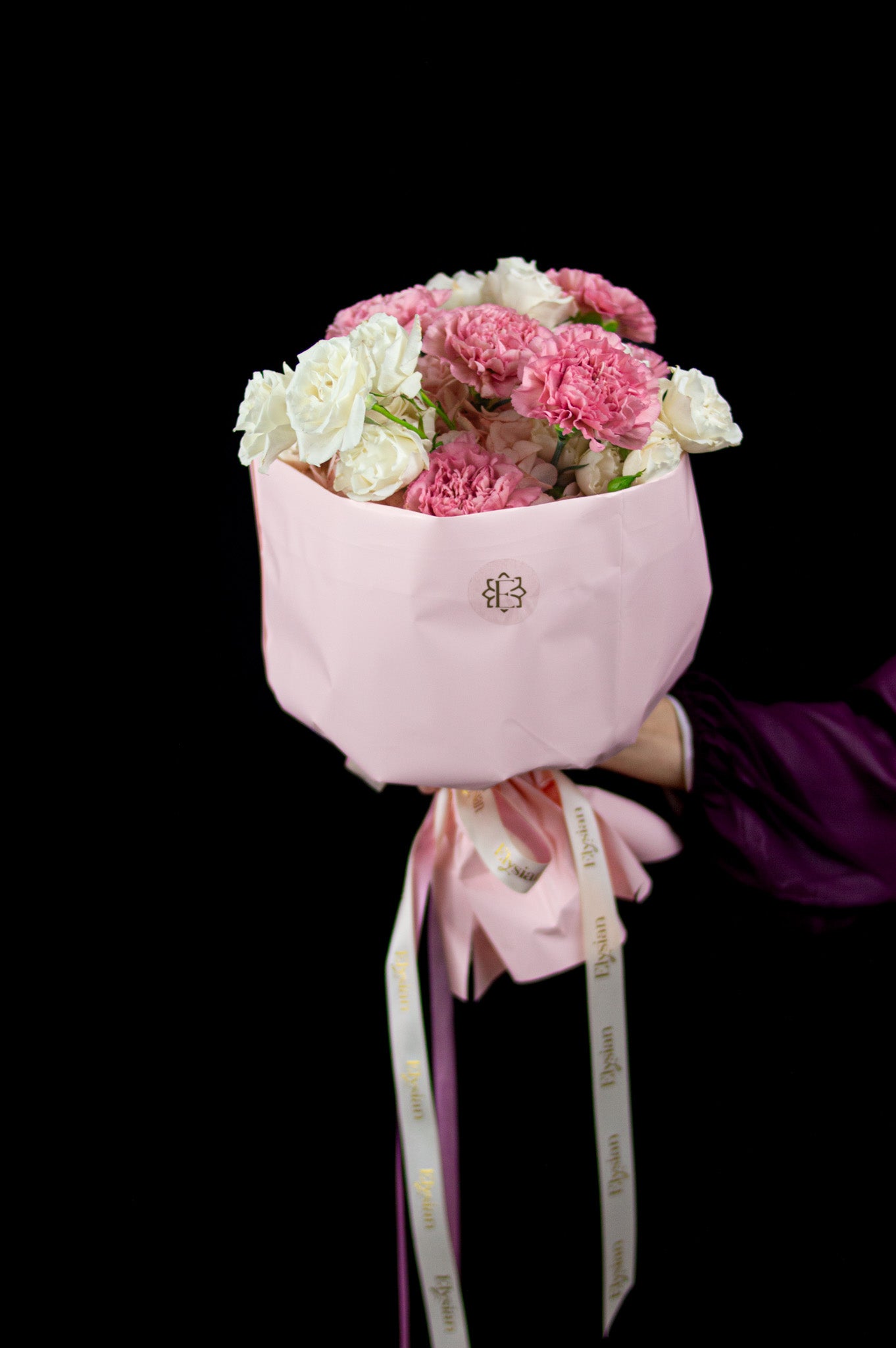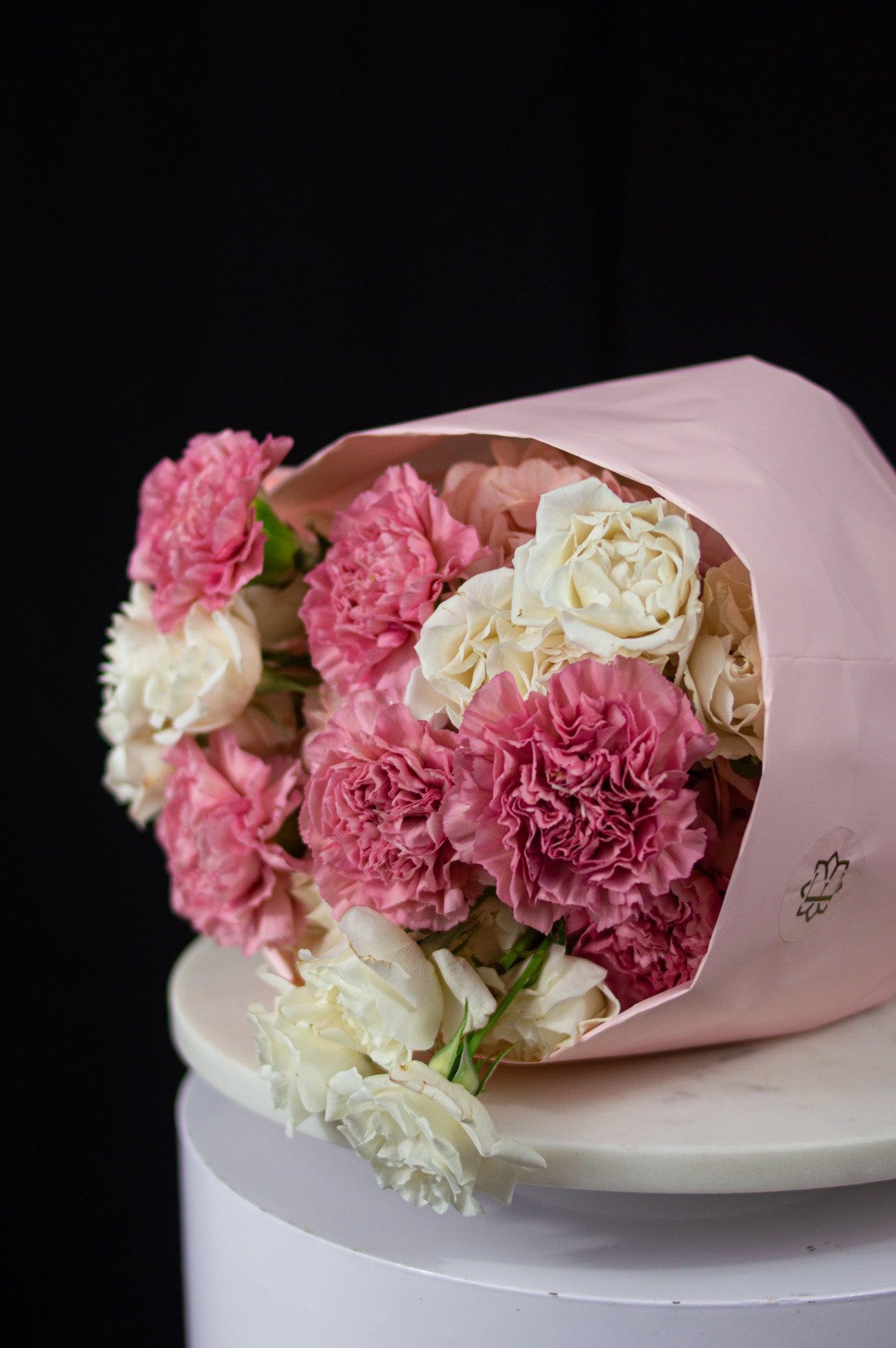 Soft, romantic, and effortlessly elegant. Vanilla Pink is a delicate bouquet of blush and creamy ivory blooms, where ruffled carnations and garden-style roses come together in a gentle, cloud-like composition. Its muted tones and plush textures create a sense of calm, warmth, and quiet affection.