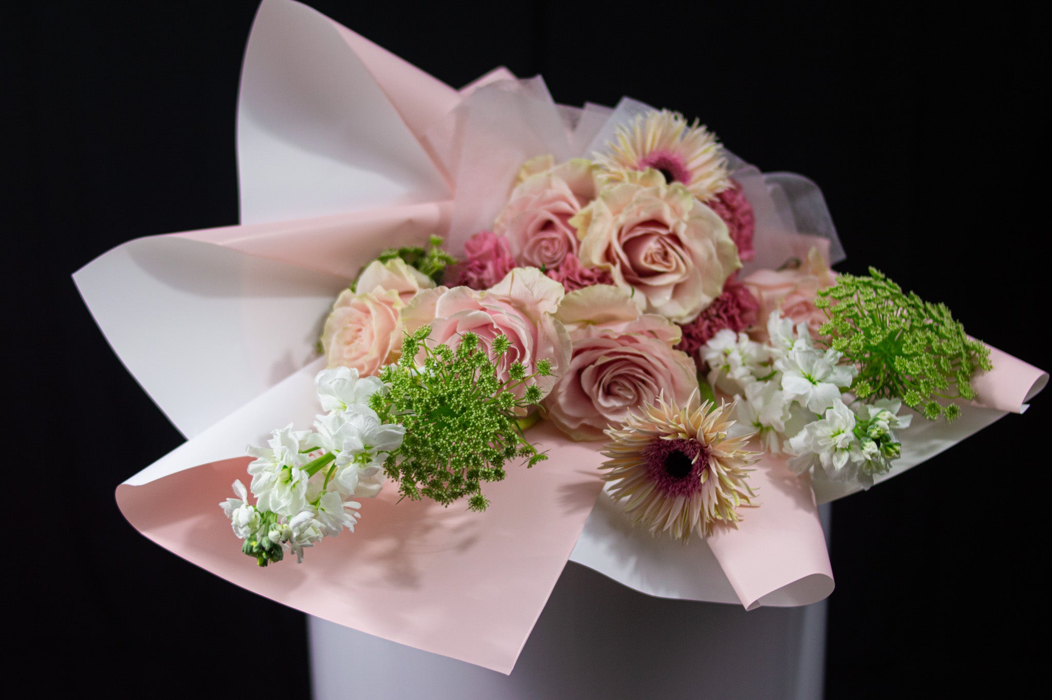 A soft expression of love, redefined. This arrangement features blush and nude roses layered with delicate seasonal blooms and fresh green accents, designed in an airy, sculptural form. Light, romantic, and thoughtfully composed, it captures love in its most tender and modern state.