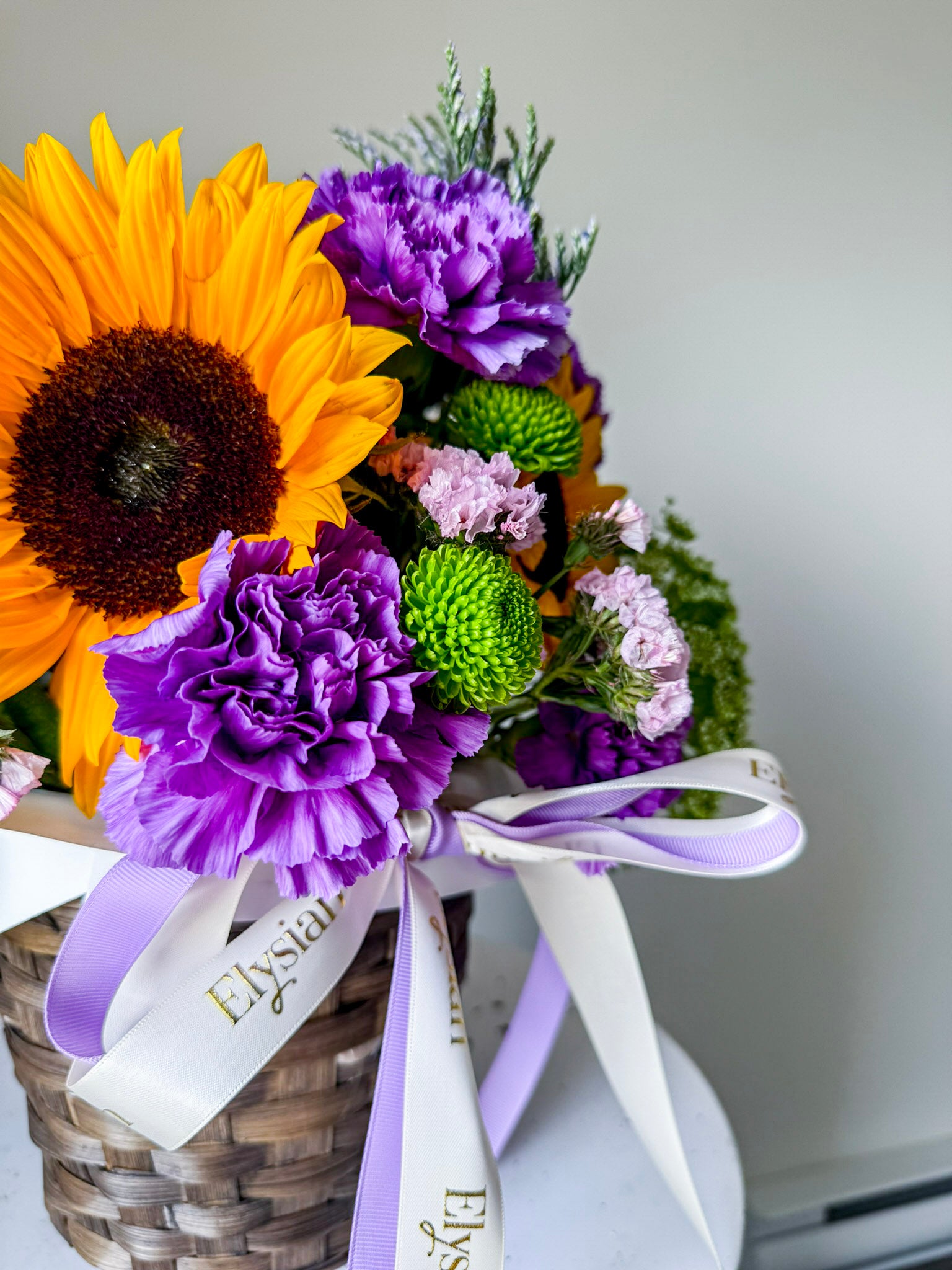 Discover the ideal floral gift with our vibrant basket arrangement, which features a harmonious blend of sunflowers, carnations, and various fillers. Handcrafted with care, this colorful arrangement is designed to brighten any occasion. Whether it's a birthday, anniversary, or simply a thoughtful gesture, our flower box is sure to impress and bring joy.